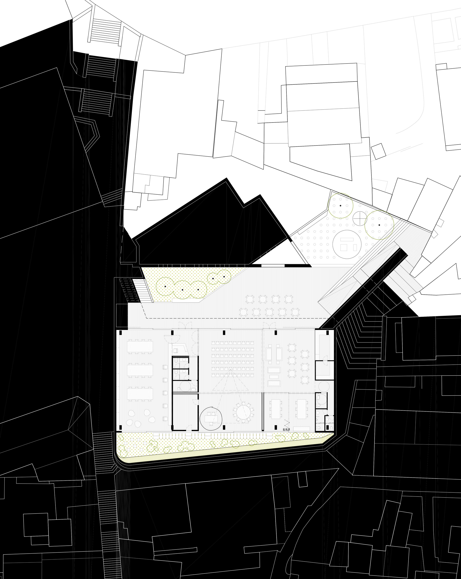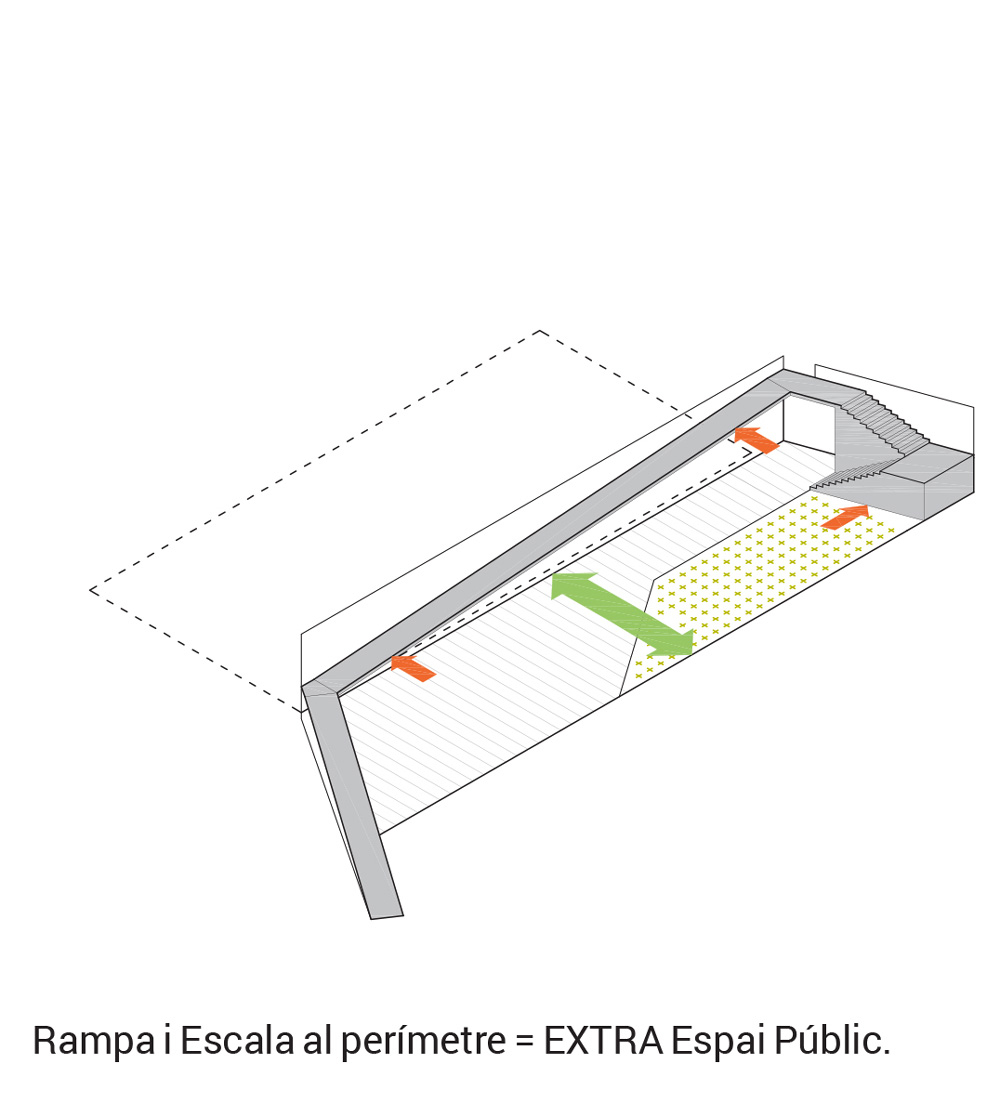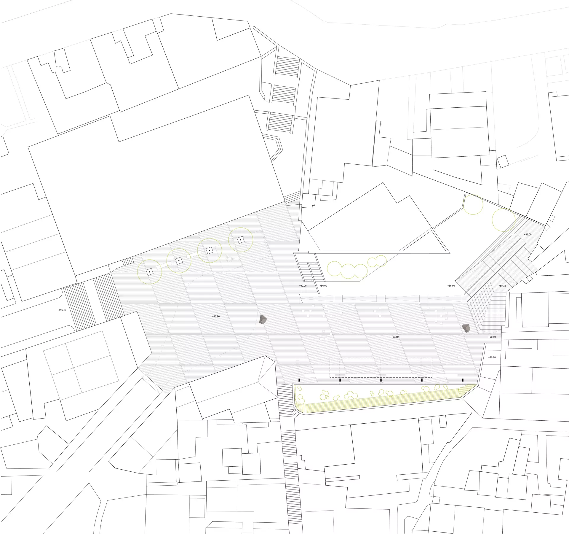 Por otro lado, se tiene especial cuidado en crear unas conexiones cómodas y que cumplas estrictamente con las regulaciones para personas con movilidad reducida. La rampa y escaleras que conectan directamente los niveles +90 y +86 están integradas en la arquitectura del centro socio-cultural; tal como hacen los pasajes en el entorno de la plaza. De esta manera, no se construye una rampa como un elemento independiente y protagonista, sino que libera espacio público y se integra fluidamente con él.