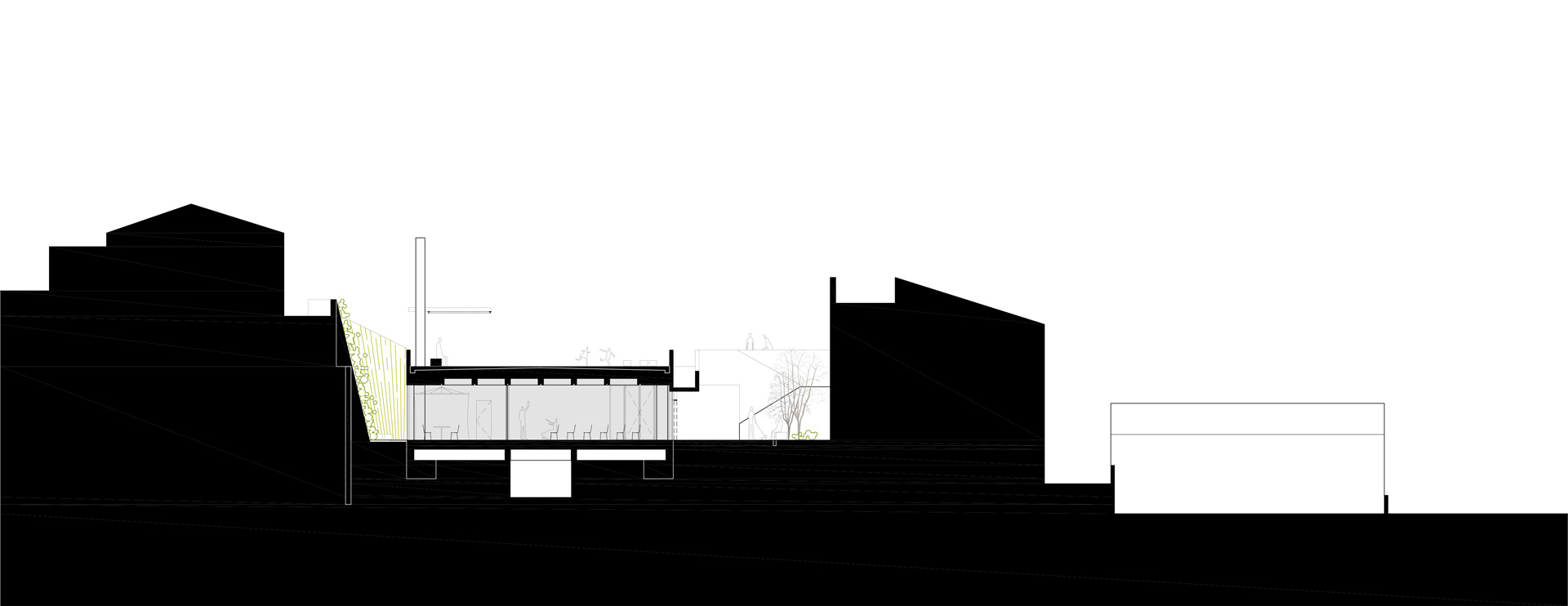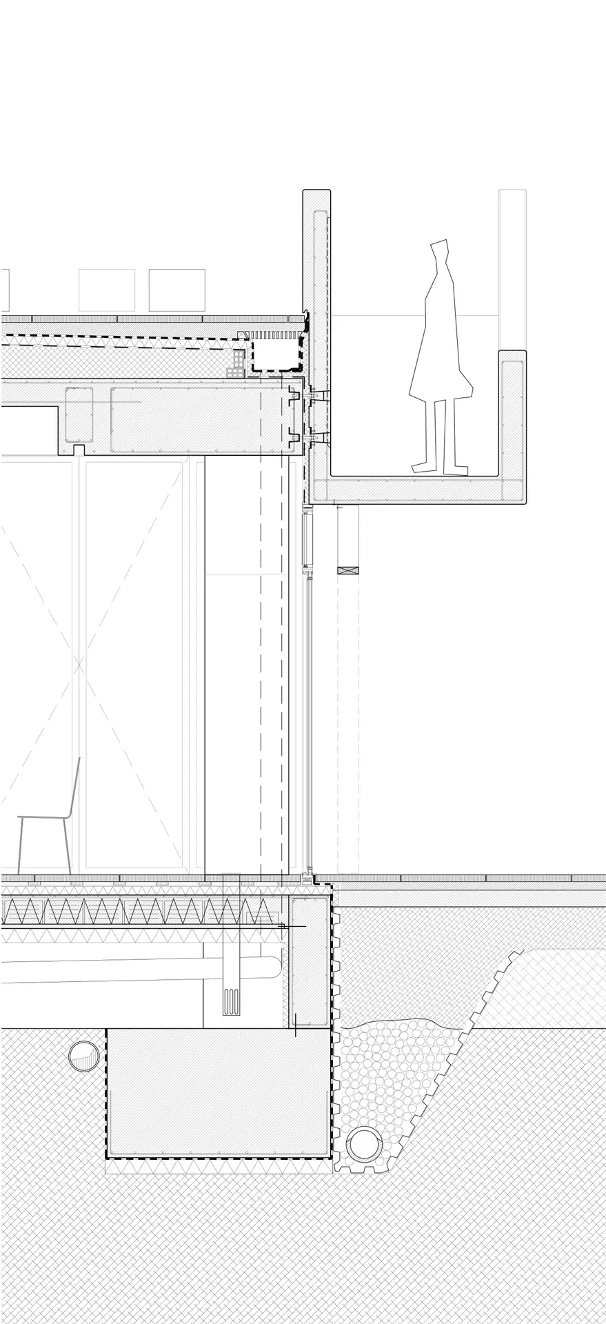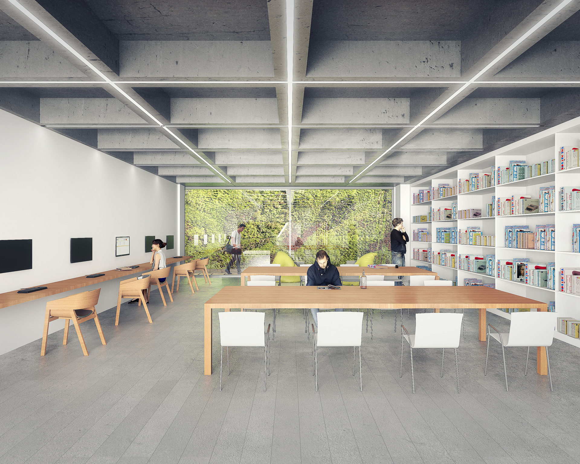 Por otro lado, se tiene especial cuidado en crear unas conexiones cómodas y que cumplas estrictamente con las regulaciones para personas con movilidad reducida. La rampa y escaleras que conectan directamente los niveles +90 y +86 están integradas en la arquitectura del centro socio-cultural; tal como hacen los pasajes en el entorno de la plaza. De esta manera, no se construye una rampa como un elemento independiente y protagonista, sino que libera espacio público y se integra fluidamente con él.