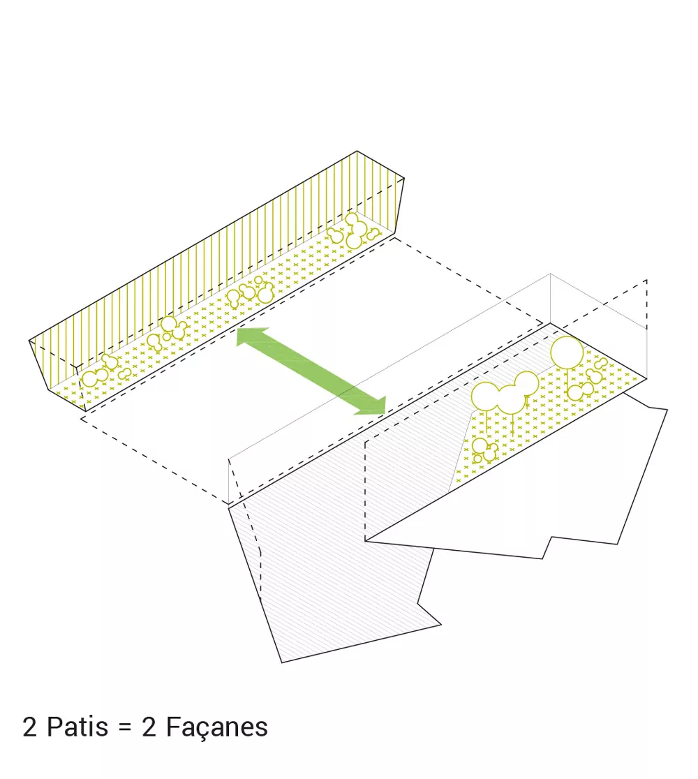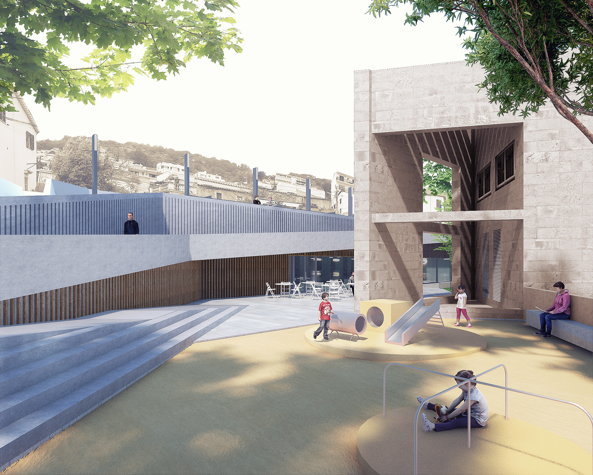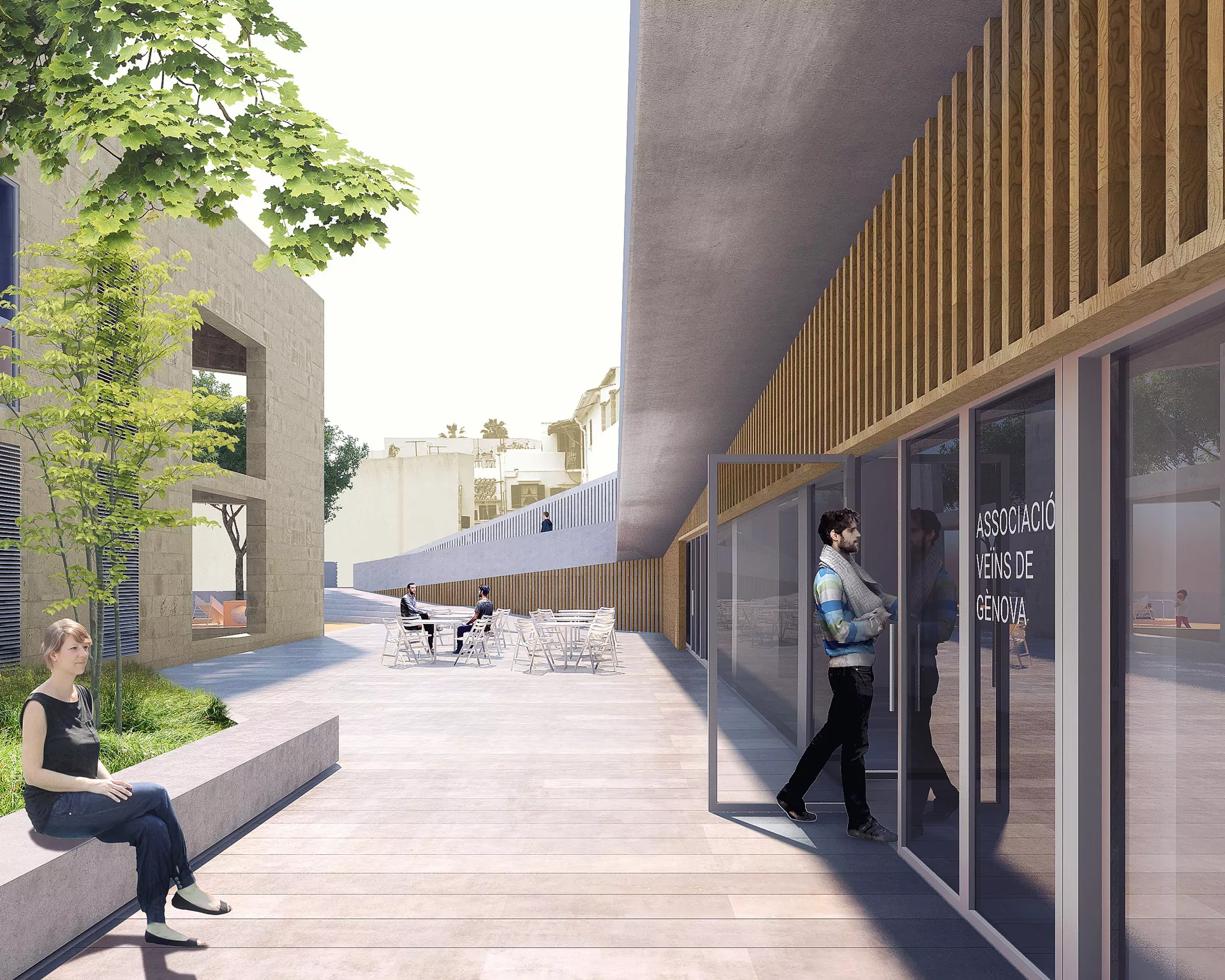 Se genera un espacio público nuevo y amplio en el nivel +86 para acceder al centro Socio-cultural, junto con el área de juego para niños.En la cubierta del centro Socio-cultural se genera un gran espacio abierto, el pavimento se extiende hacia la Plaza de Sant Salvador para pacificar su tráfico rodado. De esta manera, se suman las áreas de las dos plazas, formando un nuevo y gran espacio abierto en el barrio de Génova.