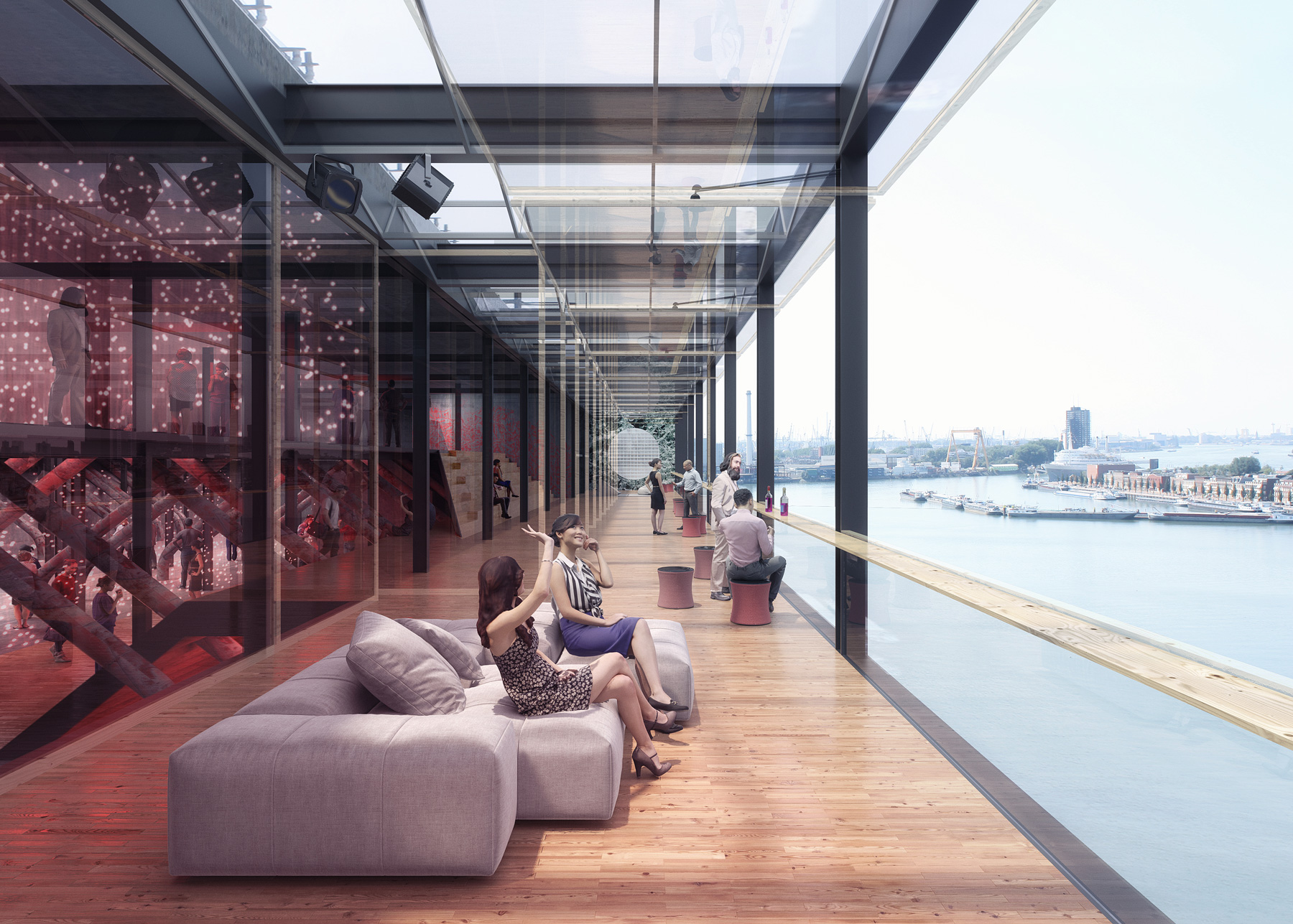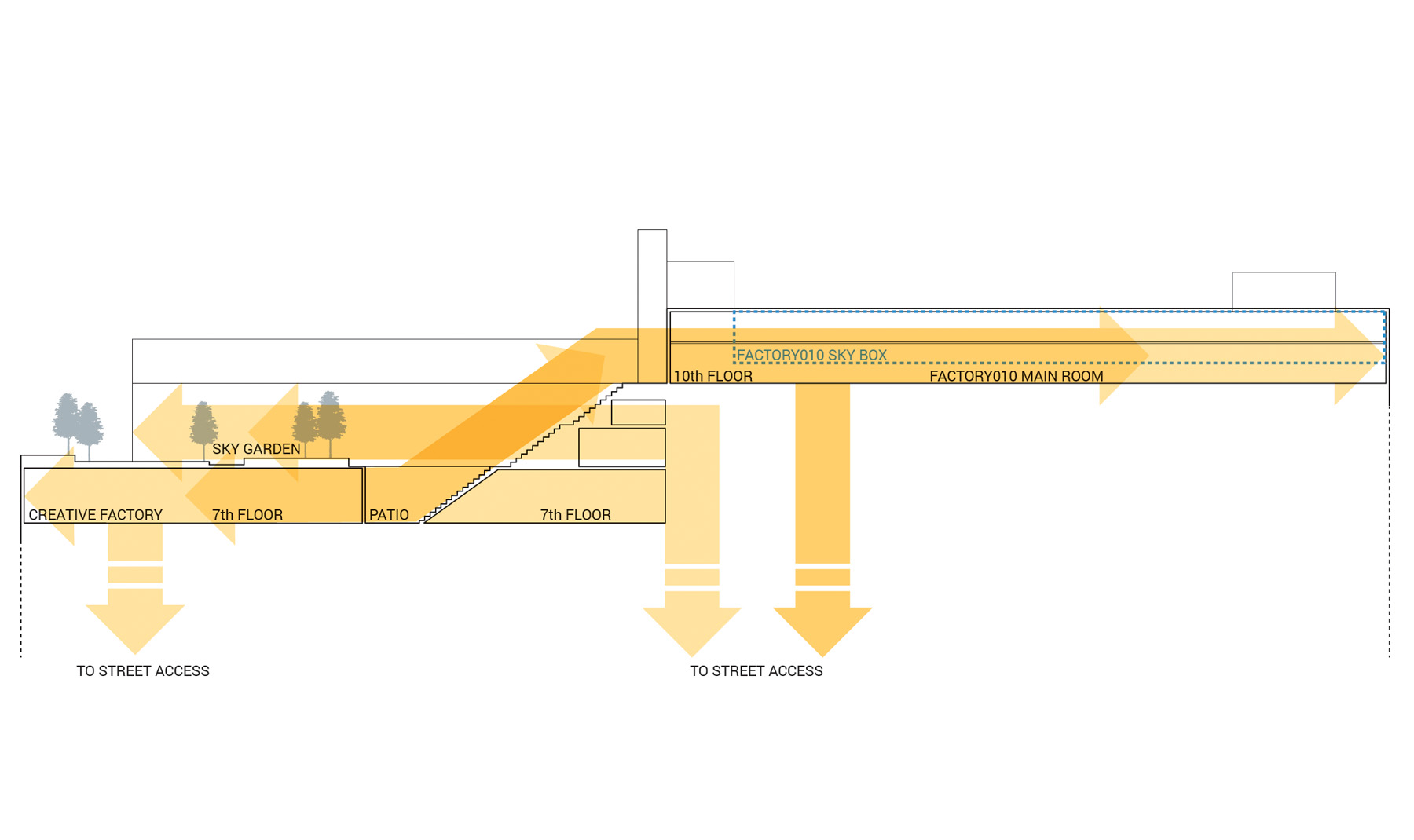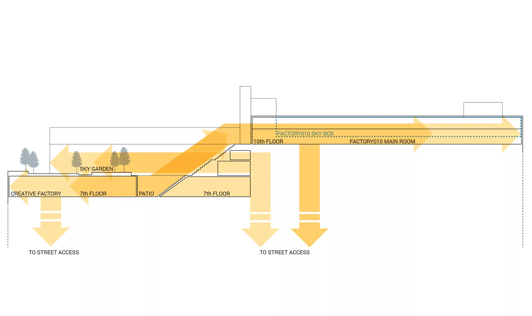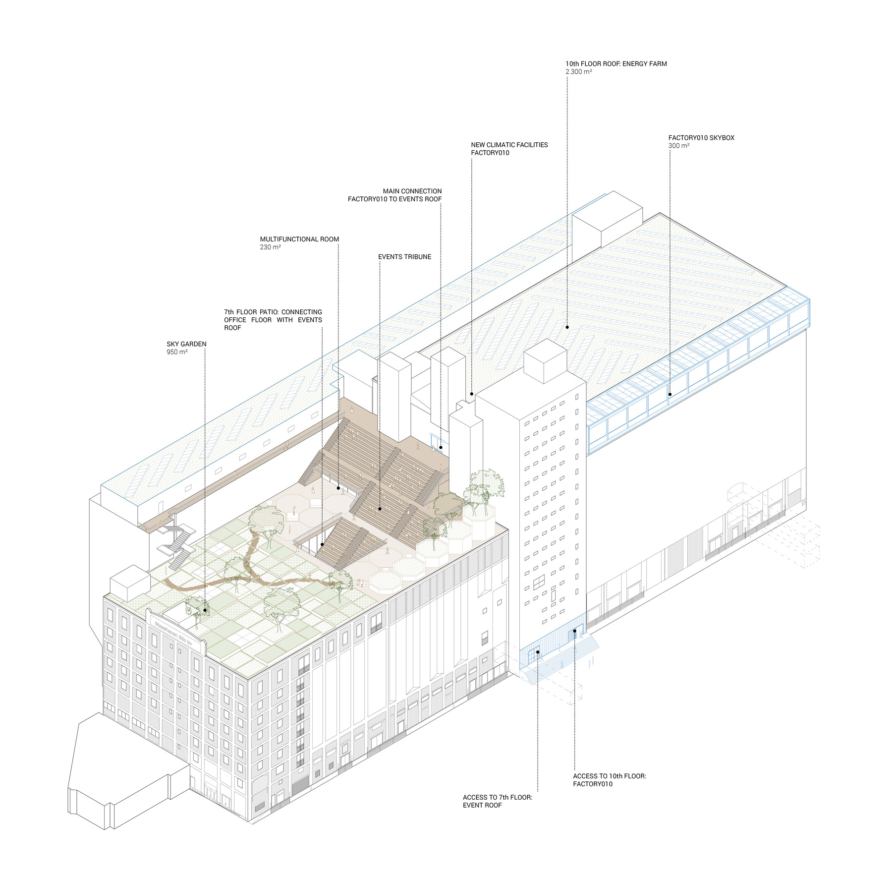 El nuevo diseño recupera las hermosas geometrías ocultas de los silos de hormigón para transformar la cubierta y las últimas plantas del edificio. En el edificio Stok se encuentra el Event Deck, un espacio multifuncional al aire libre en el que se pueden celebrar diversos eventos para hasta 1.000 personas (conciertos, obras de teatro, presentaciones de productos, eventos de empresa, bodas, seminarios, etc.) mientras se disfruta de las vistas a todo el skyline de Róterdam. El Event Deck está acompañado por el Sky Garden, un jardín de 950 m² elevado 35 metros donde los usuarios pueden disfrutar de la diversidad de plantas que van cambiando a lo largo de las estaciones. Este Event Deck se completa con una tribuna multifuncional que conecta la planta 7 (Fábrica Creativa) y la planta 10 (Fábrica010) con el Event Deck y alberga debajo una sala multiusos, 230 m² de espacio auxiliar para las actividades al aire libre.