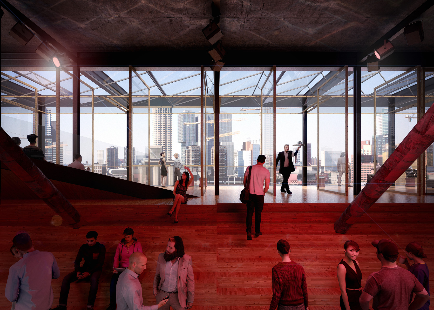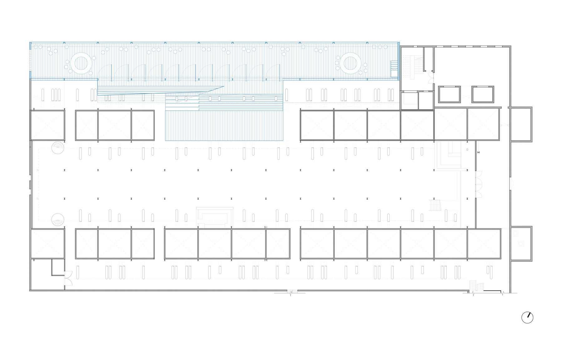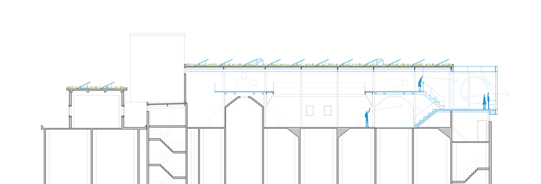 La ampliación del club Now&Wow transforma el oscuro espacio interior de la sala principal de la discoteca en un dinámico espacio escalonado abierto al skyline de la ciudad a través de una nueva caja de cristal. El Skybox presenta un espacio diáfano y transparente, con un sistema de dos fachadas acristaladas que le permite adaptarse a las condiciones climáticas de las cuatro estaciones del año, protegiéndose del viento, la lluvia y el sol. La estructura del skybox refleja en la fachada el ritmo de la estructura del silo oculto. Los niveles de la sala principal, Skybox y entrepiso, están conectados por una tribuna escalonada, creando un cruce dinámico de visiones.